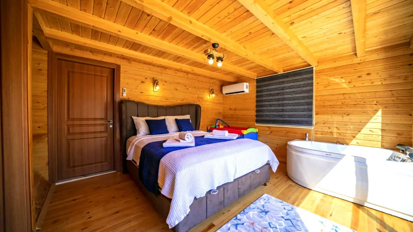1 adet çift kişilik yatak, jakuzi, elbise dolabı, makyaj masası, komodin, klima ve banyo–WC bulunmaktadır.