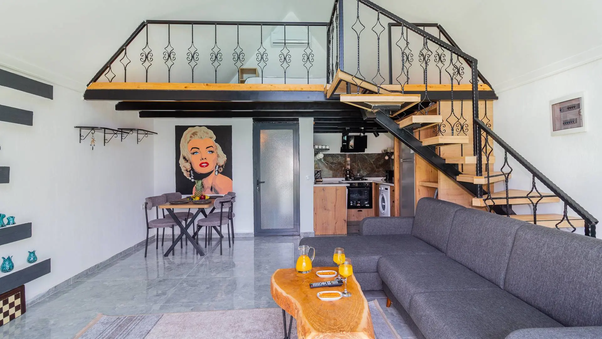 Salon bölümünde TV, oturma grubu ve sehpa gibi temel eşyalar yer almaktadır.