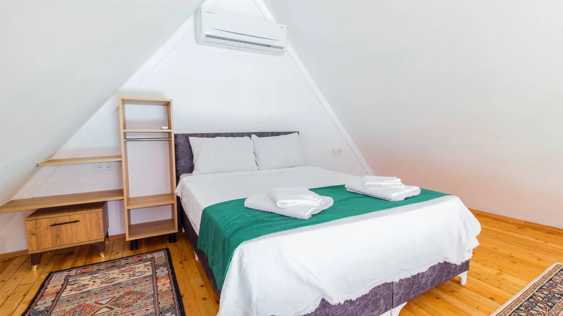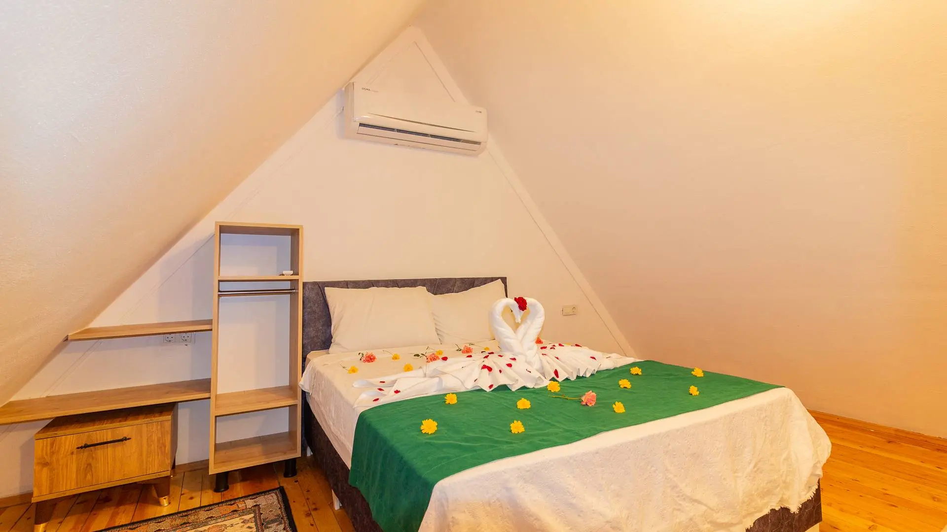 1 adet çift kişilik yatak, klima, komodin ve elbise dolabı bulunmaktadır.